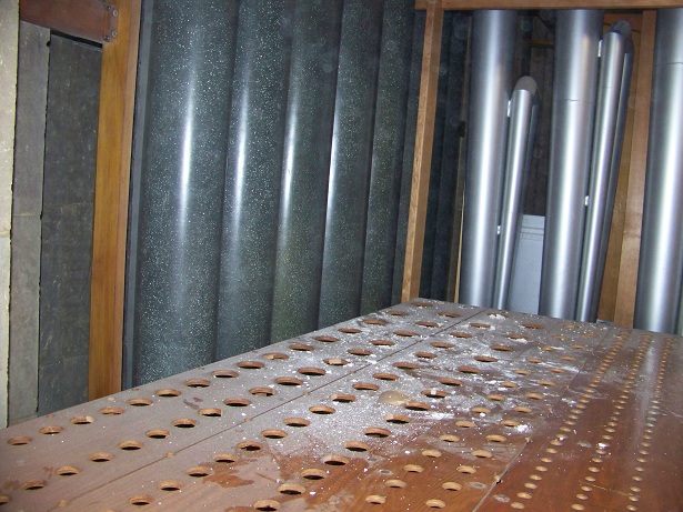 The 32' Bombarde as seen from the organ chamber floor looking up. You can also see the repaired ceiling (gray) above the pipes.