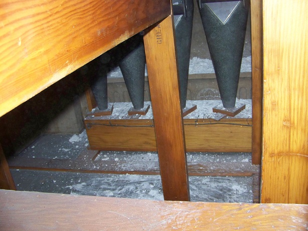 Chunks of plaster have been dropping off the ceiling and falling into the pipes. The top of the 32' Contra Bombarde is to the left.